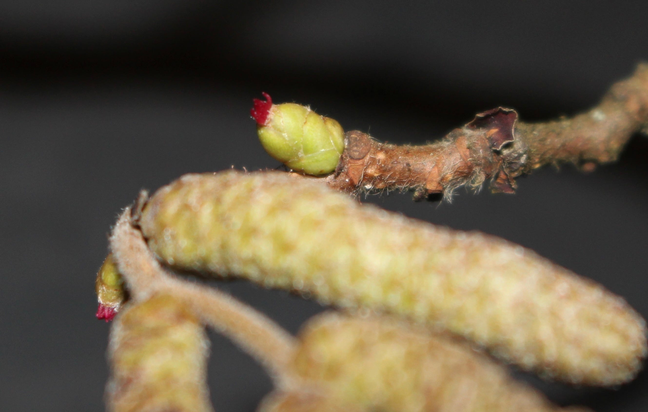 I went outside to photograph the tree and suddenly became aware of the female bud. It is not as obvious as those long male catkins, you could easily miss it - yet it is small and fierce and incredible - look