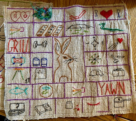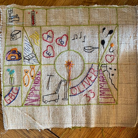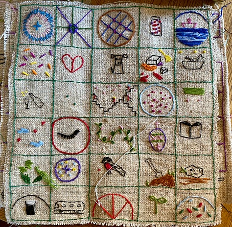 Yet this thread is the actual warp and weft of my identity - every other thread is stitched and embroidered on top of this itchy, bumpy, uncomfortable fabric that I have woven my life and identity from. I think of it as the rough linen I use for my embroidery. Each section is a month and each motif a day - I stitch my incredibly beautiful and often painful life, onto a rough, harsh, linen.